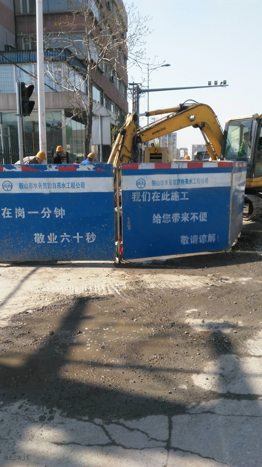 由于陶南街附近工廠較多,為防止進出車輛造成交通堵塞,所以此次工程采取的是全封閉式施工。在挖掘溝槽過程中管線以50m為一個段落,并用安全圍擋封閉作業(yè)。鋪設(shè)管線和溝槽回填同時進行,既提高了工作效率又保證了居民通行的安全。在溝槽及接點工作坑回填完畢后,對施工路面進行沖洗清掃,保證了路面整潔。