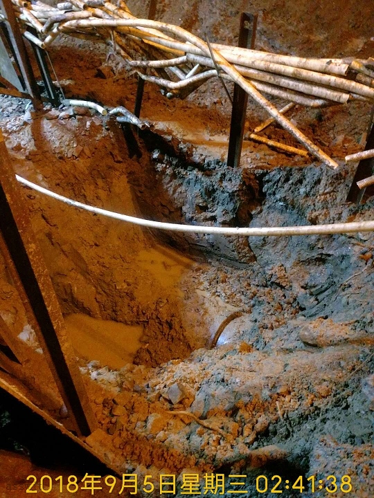 接到總公司調令后,工程公司經理親自帶隊第一時間到達搶修現場。由于上次維修供水剛恢復,若再次停水維修,將造成千山地區(qū)、大孤山地區(qū)、海諾、橡樹灣的大面積停水。經現場勘察發(fā)現3處難點。1、坑內稀泥污水較多,此次漏水維修定為不停供維修。2、漏點上方有通訊管線,由于沒有支撐,部分已脫落坑底。3、漏水部分管線距地面5米多深。針對上述情況,我部對維修現場坑上坑下稀泥進行整理,對漏水部分基坑采用鋼板槽鋼支護且將脫落坑底的通訊線纜進行重新加固。由于漏水部位距地面近7米多深,普通挖機無法達到維修作業(yè)操作深度。在此危急時刻為了縮短搶修時間,我公司胡經理聯系專用長臂挖掘。在總公司領導關注及相關部門協(xié)調下,當日凌晨2點發(fā)現漏點,在對漏水接口反復確認后為鉛口,為此對漏水鉛口直接加固。3點40漏水止住。