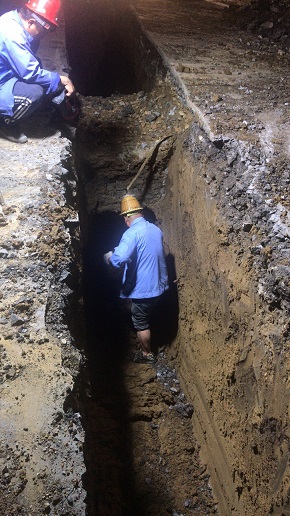 由水務(wù)工程有限公司管網(wǎng)一組承擔(dān)施工任務(wù)的山南街配水DN600管線改造工程北起烈士山,南至解放路,全長(zhǎng)共930米。由于該工程地處山南街車(chē)流量非常大的路段,白天施工影響車(chē)輛通行,從五月進(jìn)場(chǎng)就一直采取夜間施工的模式,每天晚九點(diǎn)開(kāi)始施工,一直持續(xù)到凌晨四點(diǎn)。由于地下障礙較多,供暖、燃?xì)狻⑴潘裙芫€交錯(cuò)復(fù)雜,夜晚施工給工人們帶來(lái)很大困難。為了不影響白天車(chē)輛正常行駛,管網(wǎng)一組每晚施工完都要恢復(fù)路面,進(jìn)行除塵和路面沖洗。共動(dòng)用施工人員四十多人,挖掘機(jī)3臺(tái),降塵、沖洗等設(shè)備十余臺(tái)。截止到發(fā)稿還有100米頂管部分等待施工,預(yù)計(jì)七月上旬完成全部施工任務(wù)。