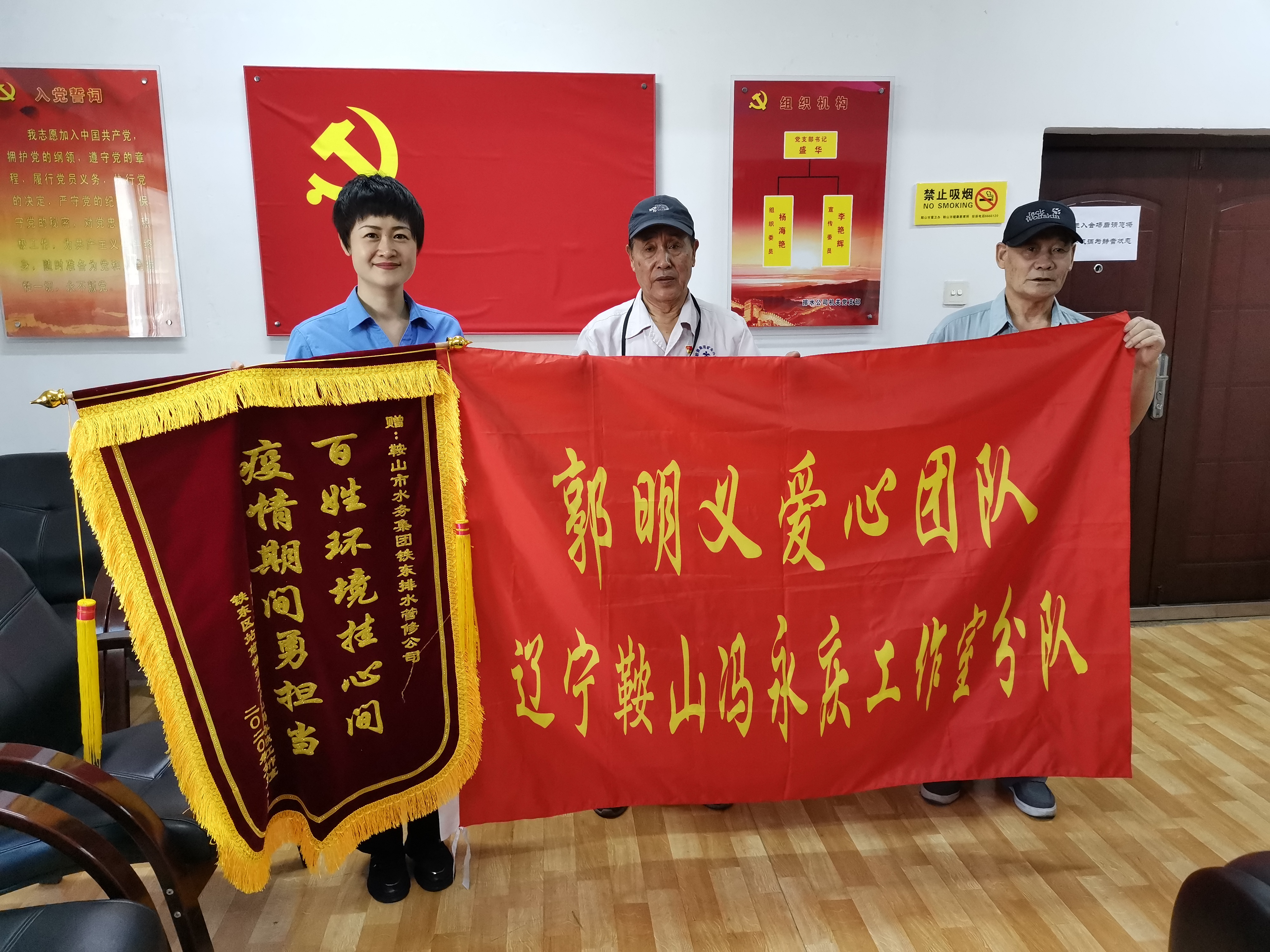 近日,郭明義愛心團隊馮永慶等人,代表鐵東站前街道馮永慶黨員鄰里服務站及全體居民將寫有“疫情期間勇?lián)?百姓環(huán)境掛心間”的一面錦旗送到排水公司,對上半年來排水公司勇于擔當社會責任、樂于奉獻的精神給予高度贊揚。對排水鐵東管修分公司,心系百姓,為民服務的工作熱情表示衷心的感謝。排水公司黨委副書記、工會主席孟曉芳代表排水公司接受了錦旗。