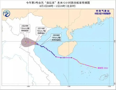 “森拉克”:南海熱帶低壓于8月1日下午2點加強為今年第3號臺風(fēng)“森拉克”(熱帶風(fēng)暴級)(英文名稱:Sinlaku;名字來源:密克羅尼西亞;名字意義:傳說中的女神),并于下午3點前后掠過海南省三亞市南部海面,下午5點其中心已移入北部灣海面,中心位于海南省東方市南偏西方大約100公里的海面上,北緯18.2度、東經(jīng)108.4度,中心附近最大風(fēng)力8級(18米每秒),中心最低氣壓992百帕。