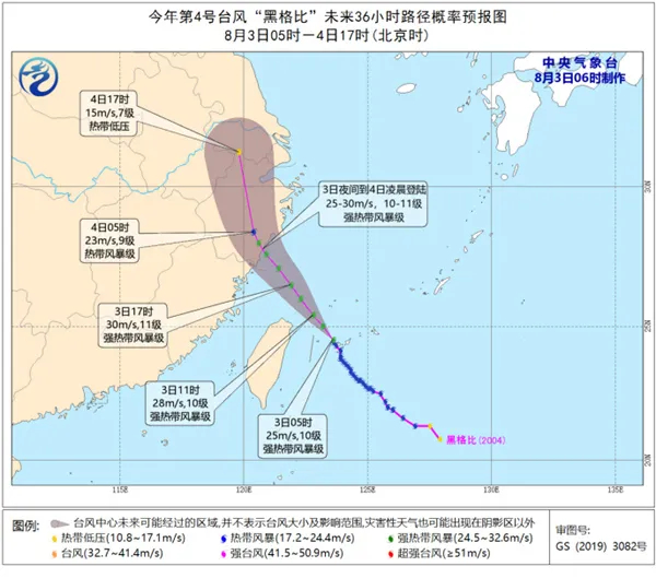 預(yù)計,“黑格比”將以15公里每小時左右的速度向西北方向移動,強度逐漸增強,并向浙閩沿海靠近,將于3日夜間在浙江中部到福建北部一帶沿海登陸(熱帶風(fēng)暴級,8級,18~20米每秒)。