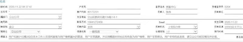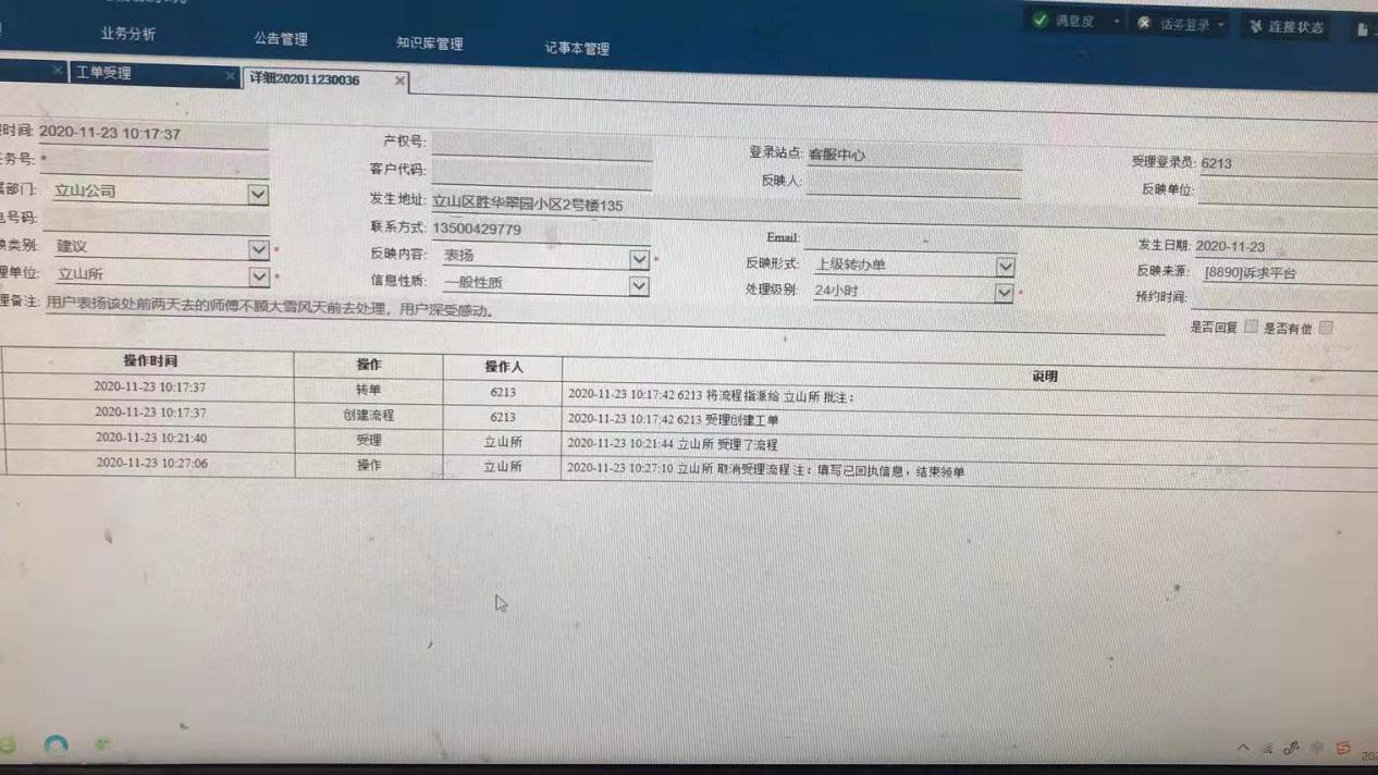 11月22日晚,立山所接到公司指令,西沙河回遷樓、勝華翠園回遷樓三處突發(fā)漏水。立山所維修班長(zhǎng)盛利,不顧風(fēng)雪交加,前往用戶家中,義務(wù)為用戶進(jìn)行維修。其中立山區(qū)勝華翠園小區(qū)漏水為表后漏水,本不在我集團(tuán)維修范圍內(nèi),盛利班長(zhǎng)考慮到雪天寒冷,加上夜間路面結(jié)冰濕滑,用戶自修困難,服務(wù)百姓用水更是集團(tuán)第一要?jiǎng)?wù),當(dāng)即為用戶表后部分義務(wù)維修。于當(dāng)晚20時(shí)左右,將漏水修復(fù)完畢,用戶深受感動(dòng)。次日,該用戶專門(mén)通過(guò)“8890平臺(tái)”對(duì)維修師傅表示感謝。