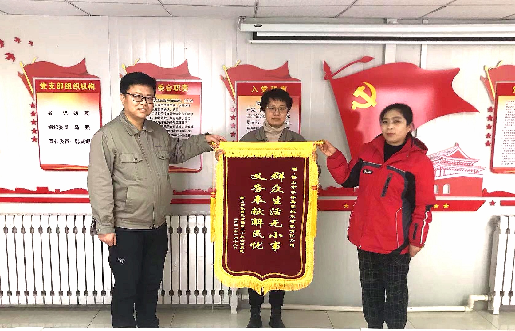 1月26日下午,社區(qū)居民代表吳女士將一面寫有“群眾生活無小事 義務(wù)奉獻(xiàn)解民憂”的錦旗送到了排水鐵西管修分公司,對(duì)鐵西管修分公司搶修隊(duì)員們?yōu)槊窠鈶n,無私奉獻(xiàn)的精神表示衷心感謝!