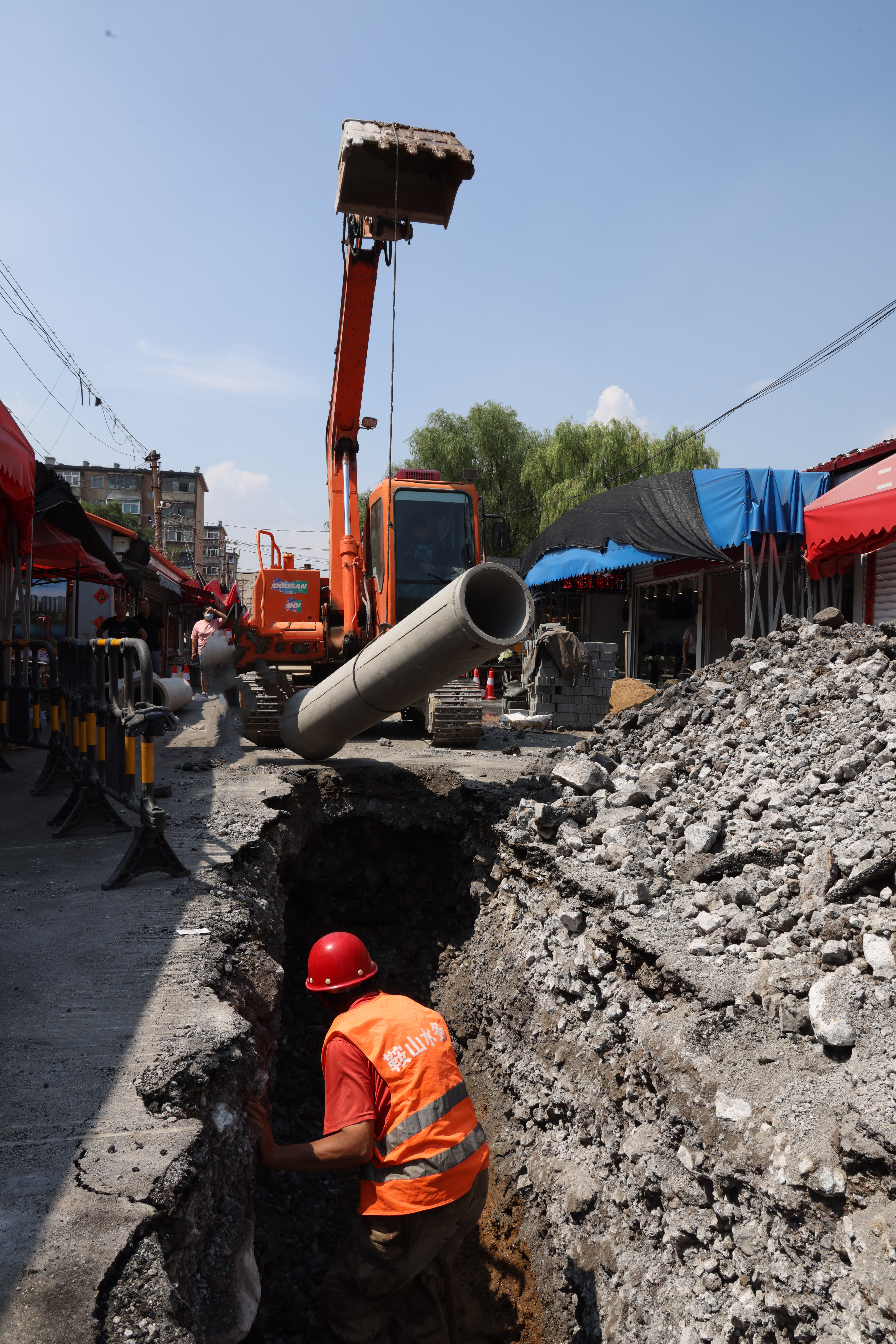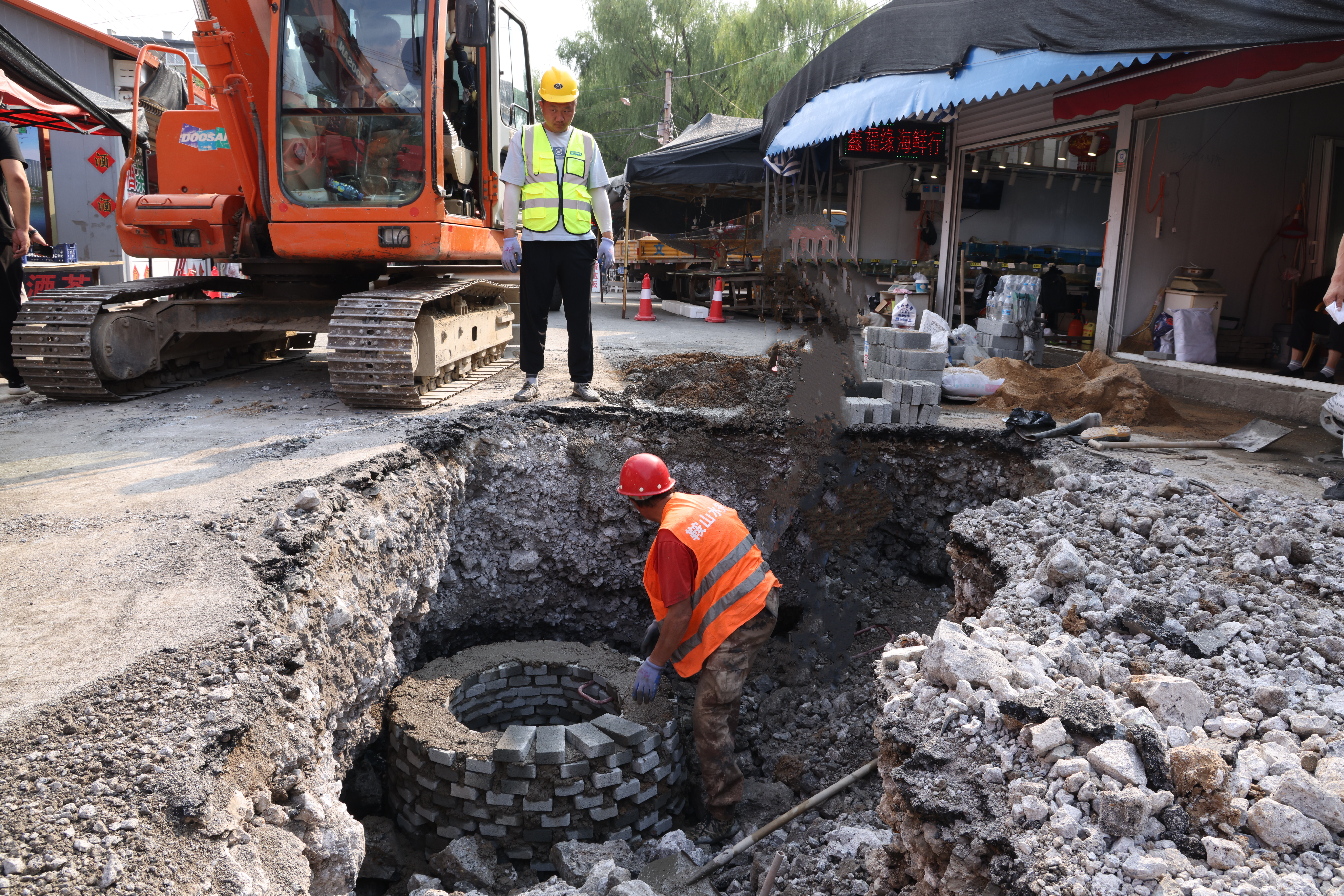 搶修現(xiàn)場位于市場內(nèi),地面上商鋪建筑情況復(fù)雜,作業(yè)面狹窄,給施工搶修帶來很大難度,搶修人員根據(jù)現(xiàn)場特殊情況制定搶修方案,耐心疏導(dǎo)行人安全繞行,確保市場來往行人的安全。為了早日完成搶修任務(wù),黨員干部充分發(fā)揮先鋒模范帶頭作用,克服天氣炎熱,作業(yè)條件艱苦等重重困難,經(jīng)過兩天緊張搶修,新建排水管線40米,新建檢查井兩座,徹底解決了該處排水不暢問題,得到了附近居民和市場業(yè)戶的一致贊揚(yáng)。