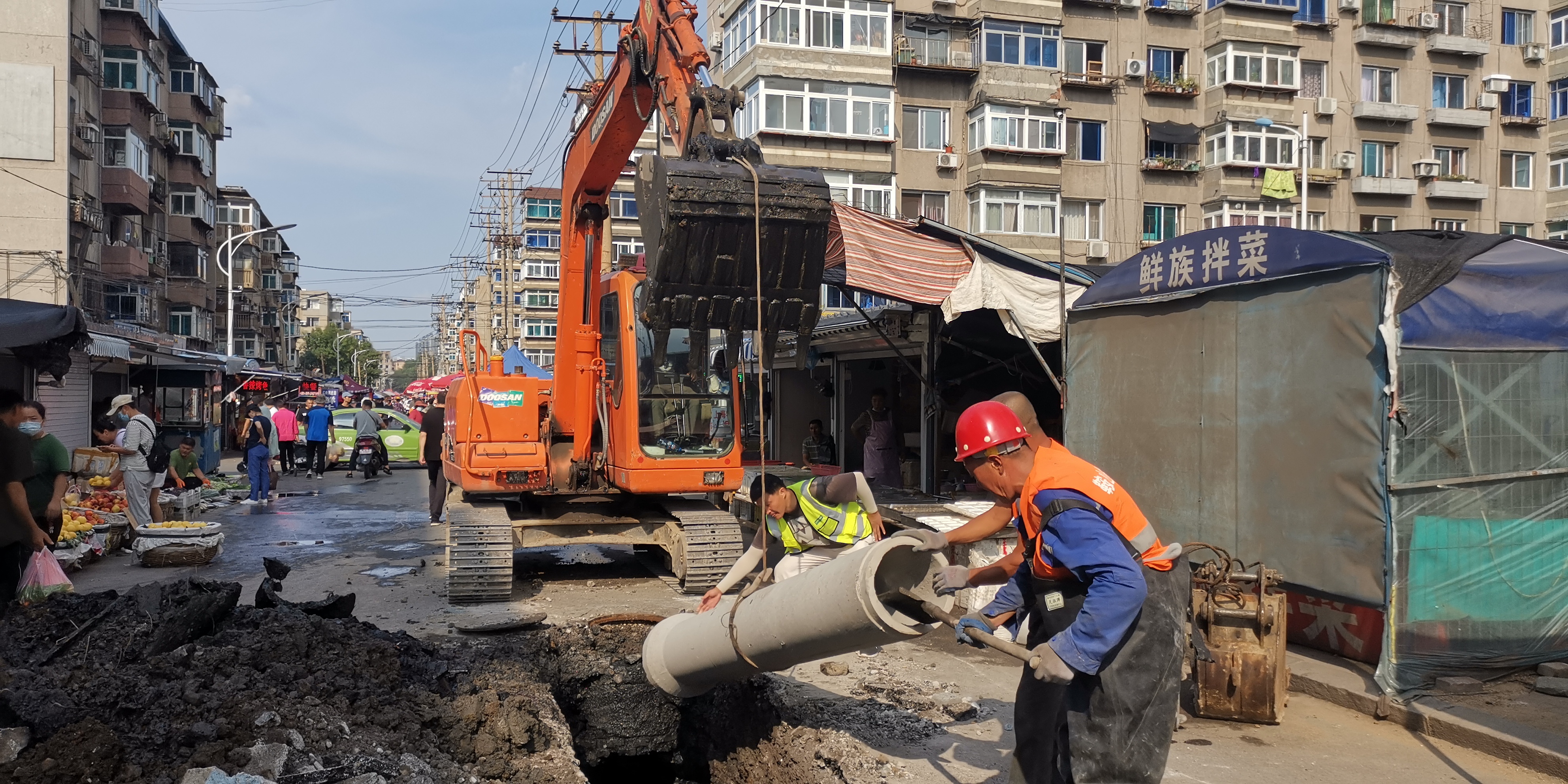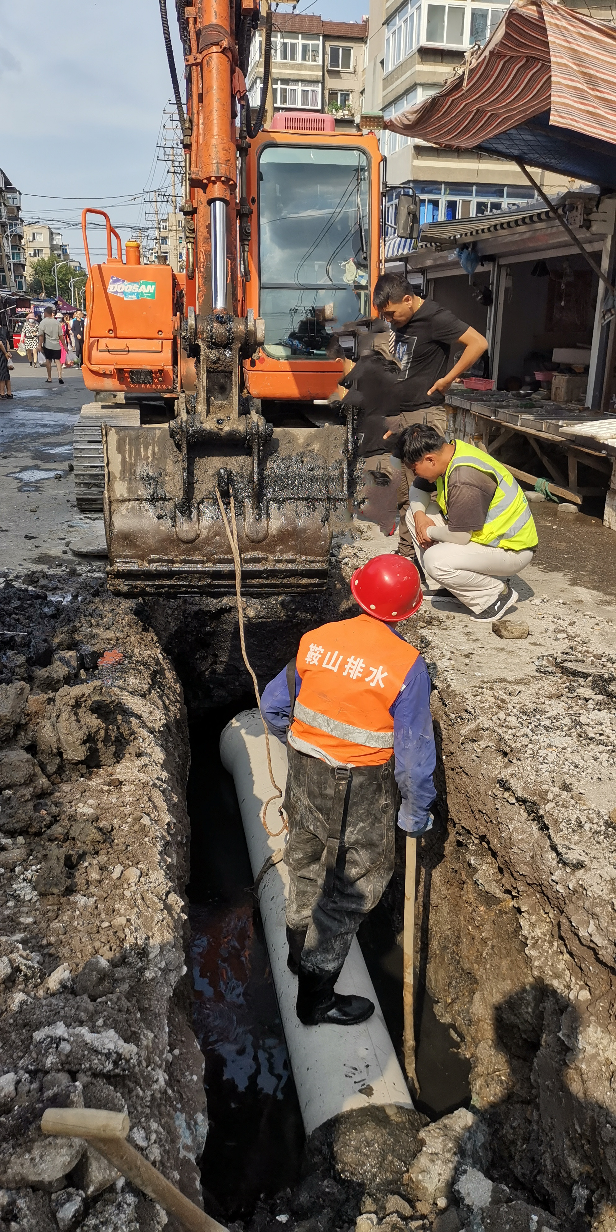 搶修現(xiàn)場位于市場內(nèi),作業(yè)面狹窄,人流密集,安全指數(shù)降低,特別是挖掘機裝卸管材、殘土時更容易出現(xiàn)安全問題,給施工搶修帶來很大難度,搶修人員根據(jù)現(xiàn)場特殊情況制定搶修方案,施工人員一邊施工作業(yè),一邊耐心疏導行人安全繞行,嚴加防范,杜絕安全事故的發(fā)生。為了早日完成搶修任務(wù),黨員干部充分發(fā)揮先鋒模范帶頭作用,克服初秋燥熱,作業(yè)條件艱苦等重重困難,經(jīng)過一天緊張搶修,新建排水管線21米,徹底解決了該處排水不暢問題,得到了附近居民和市場業(yè)戶的一致贊揚。