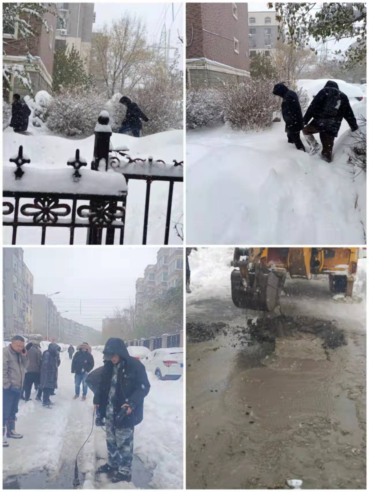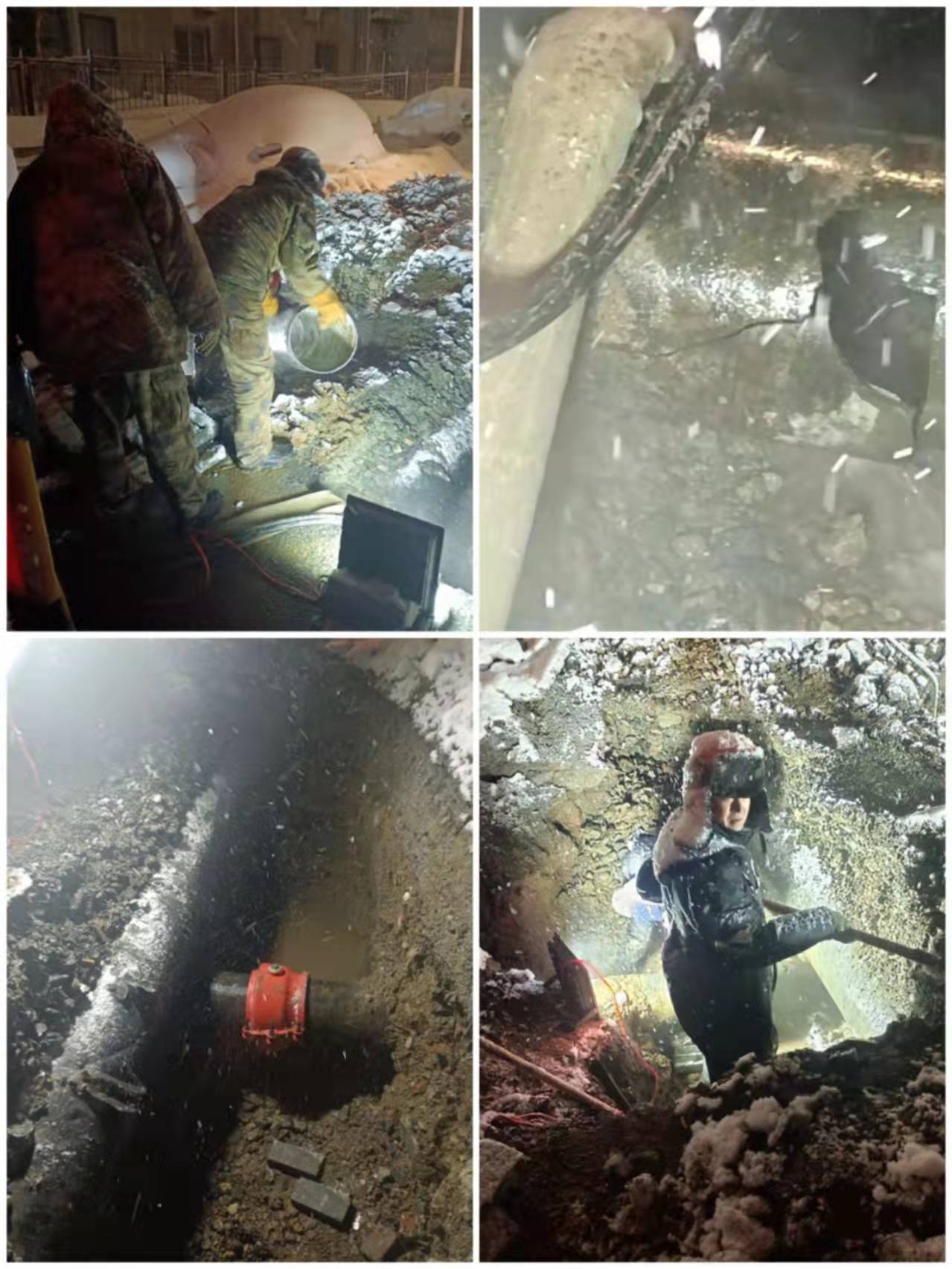 經(jīng)維修人員分組對換熱站及泵站進(jìn)水情況進(jìn)行確認(rèn),在排除換熱站及泵站漏水后,馬上對小區(qū)供水管線進(jìn)行排查,大家頂著大雪,在齊膝深的雪中查找挖掘井室,經(jīng)過近兩小時(shí)的排查將漏水區(qū)域縮小到中大帝景西北側(cè)交通崗附近,在集團(tuán)測漏公司幫助下確定漏點(diǎn)為DN300供水管線漏水。