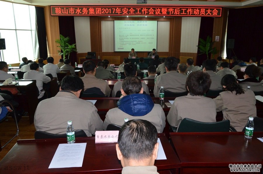 2月7日,鞍山市水務(wù)集團(tuán)召開2017年安全工作會議暨節(jié)后工作動員大會。市住建委公用事業(yè)管理處處長張偉剛,水務(wù)集團(tuán)籌備組成員,自來水總公司副處級以上干部,排水事業(yè)總公司、達(dá)道灣污水處理廠正科級以上干部,各基層單位安全部門負(fù)責(zé)人等160余人參加大會。籌備組副組長文磊主持會議。