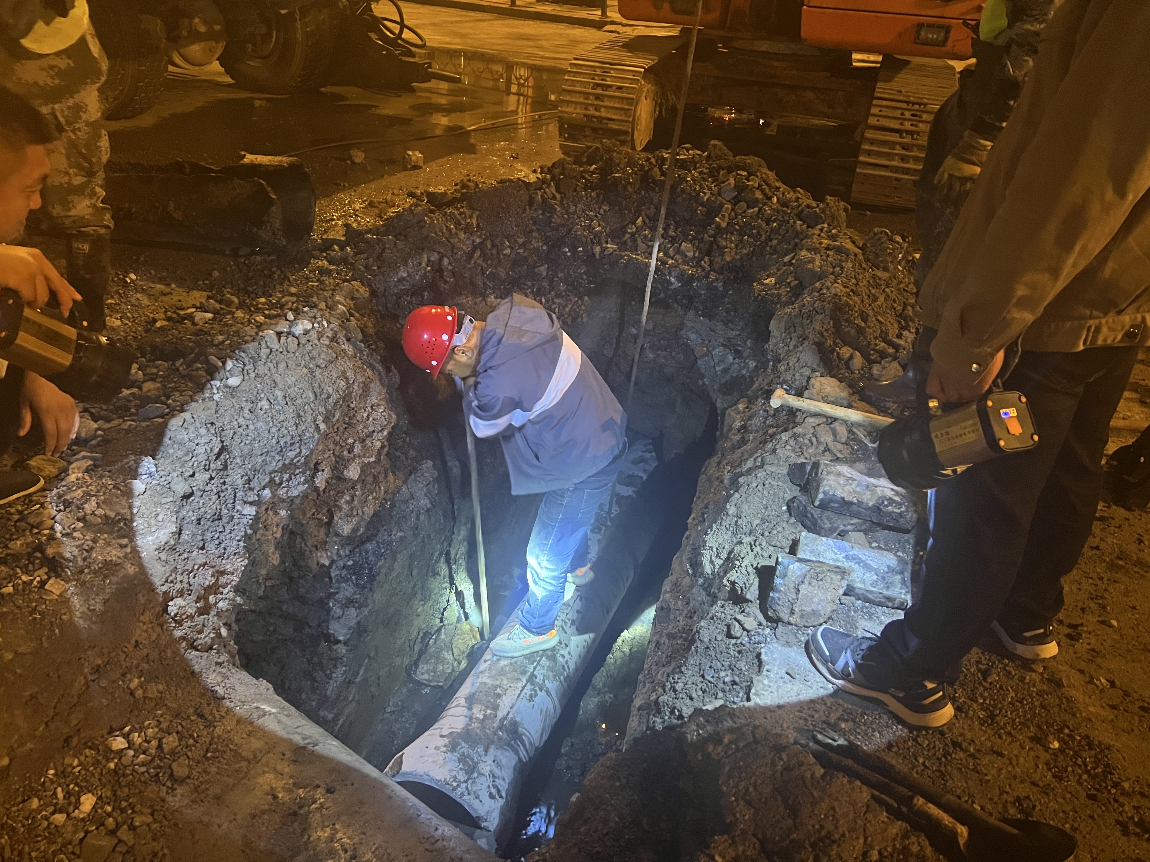 經(jīng)現(xiàn)場勘查,發(fā)現(xiàn)此處排水管道建設年代久遠,部分管線老化損壞,排水能力下降,導致管道淤堵,造成污水外溢。該路段位于客運站附近,周邊住戶、商鋪眾多,為徹底解決污水外溢問題,必須對該處管線進行翻建。排水鐵東管修所迅速組織6名搶修人員,出動挖掘機、鏟車等機械設備,6月9日晚8時,在所長宮志廣的帶領(lǐng)下連夜對該處老化排水管道進行開挖搶修。搶修過程中,排水公司副經(jīng)理、清掏養(yǎng)護維修分公司經(jīng)理李積峰等黨員干部堅守施工現(xiàn)場,靠前指揮,現(xiàn)場搶修人員挑燈夜戰(zhàn),直至10日清晨7時,翻建管線6.5米,將挖掘路面恢復完好。經(jīng)過搶修人員的連夜奮戰(zhàn),徹底解決了此處污水外溢問題,為汛期百姓出行和交通順暢提供了基礎保障。