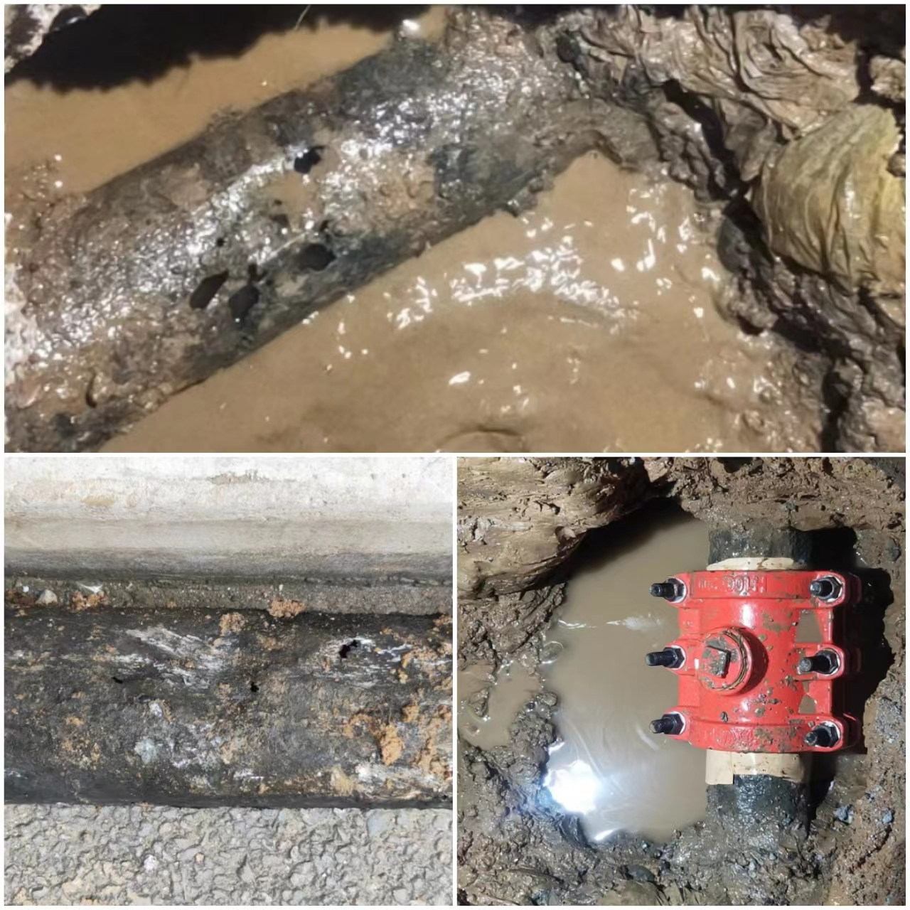 抄收班反饋沒(méi)有非居民用戶突增用水,維修班排查三井未發(fā)現(xiàn)漏水。維修班通過(guò)與該區(qū)域幾個(gè)樓的用戶詢問(wèn)時(shí),有用戶反應(yīng)綠化街52棟、46甲兩棟5樓往上沒(méi)有水,其他樓用戶供水正常。維修班將漏水重點(diǎn)轉(zhuǎn)移到這兩棟樓,經(jīng)下水井排查,發(fā)現(xiàn)有大量清水經(jīng)過(guò)該處下水。但兩個(gè)樓水門,立杠均沒(méi)有漏水聲音。所里立即求助查漏隊(duì)和分公司技術(shù)科。大家到現(xiàn)場(chǎng)排查分析后,發(fā)現(xiàn)此時(shí)52棟樓前地面有一些水印,于是決定先于此處挖掘。搶修隊(duì)立即組織人員進(jìn)行搶修挖掘,千山公司領(lǐng)導(dǎo)班子來(lái)到現(xiàn)場(chǎng)親自指揮,大家頂著烈日將此處挖開(kāi)后,發(fā)現(xiàn)漏水點(diǎn)不在此處,大家繼續(xù)擴(kuò)大挖掘,終于在夜里10點(diǎn)多查到漏水點(diǎn),是DN100下線熟鐵管老化嚴(yán)重,導(dǎo)致漏水。維修人員立即對(duì)漏水處進(jìn)行修復(fù)。在夜里12點(diǎn)前修復(fù)完畢,當(dāng)回填到一半時(shí),發(fā)現(xiàn)漏水點(diǎn)旁邊的溝槽里往外趟水,此時(shí)已經(jīng)是深夜,考慮到百姓休息以及伏天搶修人員身體透支嚴(yán)重,決定第二天繼續(xù)修復(fù)。