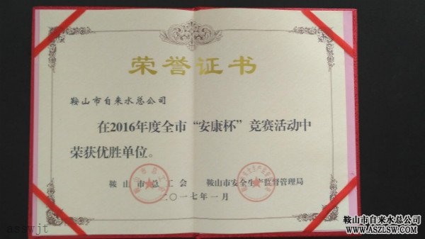近日,在市總工會(huì)、市安監(jiān)局聯(lián)合舉辦的2016年度鞍山市“安康杯”競(jìng)賽活動(dòng)中,水務(wù)集團(tuán)自來(lái)水總公司榮獲“優(yōu)勝單位”榮譽(yù)稱號(hào)。