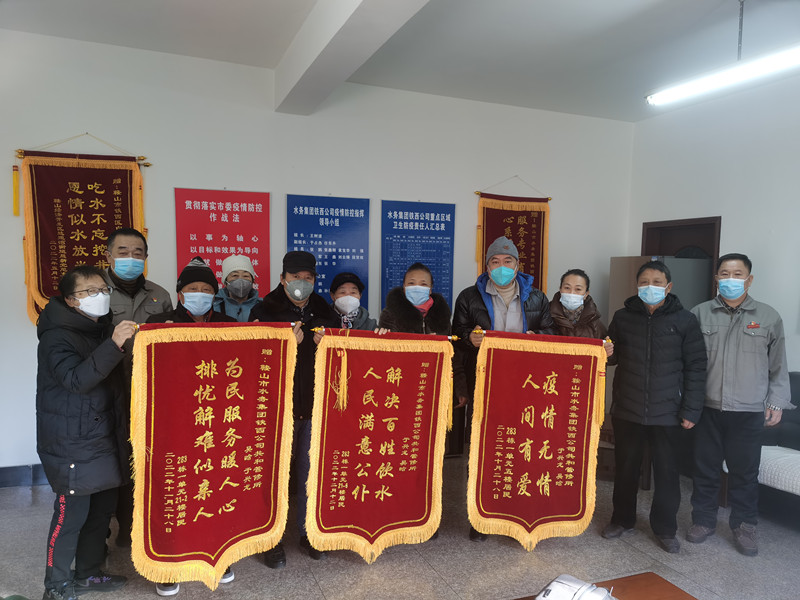 12月13日下午,家住人民路283棟一單元的十余名居民將三面印有“為民服務(wù)暖人心 排憂解難似親人”、“疫情無情 人間有情”、“解決百姓飲水 人民滿意公仆”的錦旗送到鐵西公司黨總支書記王樹波的手中。這三面鮮紅的錦旗包含了用戶濃濃的深情,代表了居民們對(duì)鐵西公司共和所吳晗、于興龍兩名維修人員在疫情防控期間優(yōu)質(zhì)、高效、熱情服務(wù)的感謝,也是對(duì)鐵西公司及共和所關(guān)鍵時(shí)刻敢于擔(dān)當(dāng)、善于作為的工作作風(fēng)的肯定。