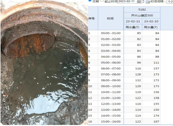 2月10日,立山公司齊大山班通過(guò)查看水量數(shù)據(jù)監(jiān)控系統(tǒng)時(shí)發(fā)現(xiàn)齊大山鎮(zhèn)內(nèi)DN500管線供水量突增,但其下線各DMA小區(qū)水量無(wú)均無(wú)明顯增加,齊大山班馬上組織人員開展查漏降差工作,并將問(wèn)題上報(bào)立山公司工程技術(shù)室。顧軍班長(zhǎng)一邊組織維修人員對(duì)鎮(zhèn)內(nèi)各個(gè)支線進(jìn)行地毯式排查,一邊請(qǐng)分公司計(jì)量管理對(duì)個(gè)別未監(jiān)控管線進(jìn)行便攜測(cè)流。通過(guò)整整一天時(shí)間,各崗位人員有條不紊,各司其職,高效對(duì)鎮(zhèn)區(qū)內(nèi)管網(wǎng)進(jìn)行排查,最終通過(guò)不懈努力,經(jīng)分段測(cè)流、地表聽音等手段鎖定漏水點(diǎn)為監(jiān)控盲區(qū)的一處已停用的DN50管線漏水所致。經(jīng)各方協(xié)助,于10日下午將該處漏水修復(fù)完畢,修復(fù)后降無(wú)效水量約1000立/日。
