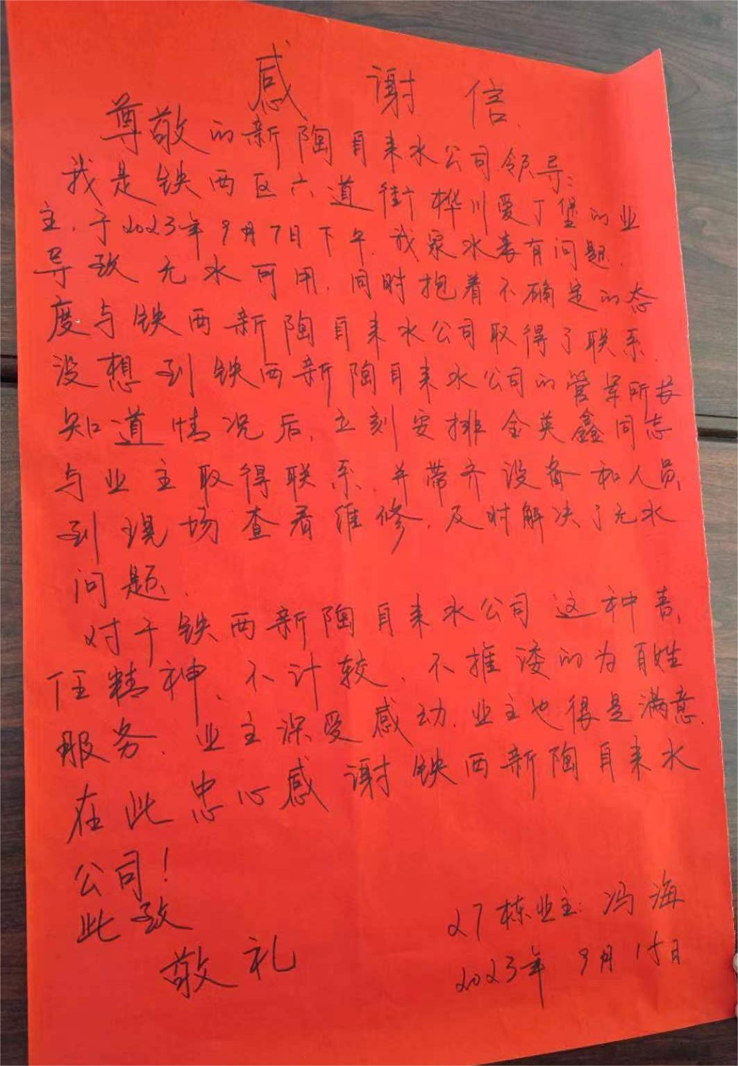 2023年9月15日,家住鐵西華川愛丁堡小區(qū)六道街381棟2單元13層的居民馮海先生將一封感謝信送到鐵西公司新陶管修所,感謝新陶所有作為、肯擔(dān)當(dāng),全心全意為百姓辦實(shí)事、解難題的工作作風(fēng)。